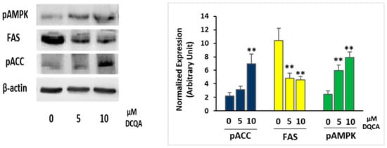 Immunoblot analysis of enzyme involved in the lipid accumulation. 3T3-L1 cells were induced with MDI and treated with or without 5 or 10 µM DCQA for 10 days. At the time of terminal differentiation, cells were collected and immunoblot was performed as described. On the left, a representative experiment is shown. On the right, the quantification of protein expression of three independent experiments is shown. Data from densitometric analyses were normalized with the β-actin expression. Data statistically significant vs. each control sample are indicated. (** p < 0.01).