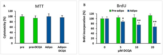 Firstly, we had to rule out the possibility that DCQA treatment could exert an initial cytotoxicity on 3T3-L1 cells. MTT assay carried out 48 h after induction excluded the notion that the DCQA-elicited inhibition of differentiation could be due to an early toxic effect (Figure 4A, blue bars). Accordingly, cell viability of non-hormone-induced pre-adipocytes was not affected by 48 h DCQA treatment as well (Figure 4A, green bars).