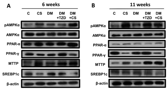 Effects of chitosan on metabolic signaling protein expression in the liver of diabetic rats with different feeding durations. (A) 6-week feeding duration; (B) 11-week feeding duration. The protein expressions for phosphorylated AMPK, AMPK, PPAR-α, PPAR-γ, MTTP, SREBP1c, and β-actin (internal control) were determined by Western blot analysis. The quantification is shown in Figure 2.