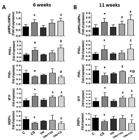 Effects of chitosan on metabolic signaling protein expression in the liver of diabetic rats with different feeding durations. (A) 6-week feeding duration; (B) 11-week feeding duration. The protein expression for phosphorylated AMPK, AMPK, PPAR-α, PPAR-γ, MTTP, SREBP1c, and β-actin (internal control) was determined by Western blot analysis. The densitometrical quantification is shown. Results are expressed as mean ± S.D. for each group (n = 4–6). The significant difference (p < 0.05) were analyzed by one-way ANOVA and two-tailed Student’s t-test. *: versus C; #: versus DM; @: versus DM + TZD.