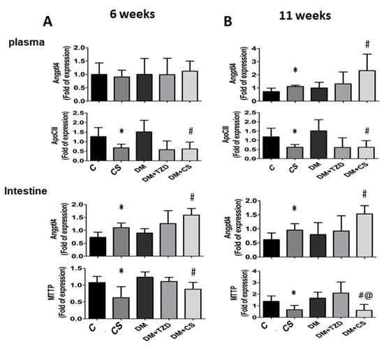 We next explored the influence of chitosan feeding duration on metabolic signaling proteins in the liver, plasma, and small intestine enzyme activities in adipose tissue in diabetic rats. As shown in Figure 1 and Figure 2, the levels of protein expression in the livers for phosphorylated AMP-activated protein kinase (AMPK) (pAMPK/AMPK ratio), peroxisome proliferator-activated receptor (PPAR)α, and microsomal triglyceride transfer proteins (MTTP) were significantly increased, and for PPARγ and sterol regulatory element binding protein (SREBP)-1c were significantly decreased in CS (versus C) and DM + CS (versus DM) groups at both 6- and 11-week feeding duration. At 6-week feeding duration, in the DM + TZD group, a significant change in protein expression was observed only for the MTTP protein, which was elevated compared to the DM group; but at the 11-week feeding duration, there were increases in the pAMPK/AMPK ratio, PPARγ, and MTTP protein expression in DM + TZD group compared to the DM group (Figure 1 and Figure 2). There was a decrease in liver PPAR-γ protein expression in the DM + CS group at 11-week feeding duration compared to DM + TZD group (Figure 2). Moreover, the levels of protein expression for plasma angiopoietin-like protein-4 (Angptl4) were not changed in all groups at 6-week feeding duration; but its levels could be significantly increased in CS (versus C) and DM + CS (versus DM) groups at 11-week feeding duration (Figure 3 and Figure 4). The plasma apolipoprotein C3 (ApoCIII) and intestinal mucosal MTTP protein expression levels were significantly decreased, and the intestinal mucosal Angptl 4 protein expression levels were significantly increased in CS (versus C) and DM + CS (versus DM) groups at both 6- and 11-week feeding duration (Figure 3 and Figure 4). There were no changes in the levels of protein expression for Angptl4, ApoCIII, and MTTP in the plasma or intestine in the DM + TZD group (versus DM) at both 6- and 11-week feeding duration (Figure 3 and Figure 4). There was a significant decrease in intestinal MTTP protein expression in the DM + CS group at 11-week feeding duration compared to the DM + TZD group (Figure 4).