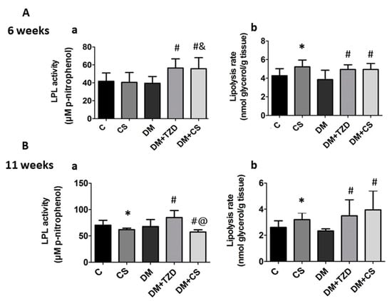 Moreover, the lipolysis rate was significantly increased in CS (versus C), DM + TZD (versus DM), and DM + CS (versus DM) at both 6- and 11-week feeding duration (Figure 5).