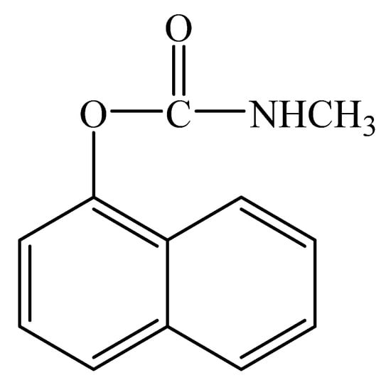 Carbaryl (Figure 1) is a carbamate insecticide applied to crops which has been classified as a possible carcinogen by the United States Environmental Protection Agency [2]. Carbaryl can harm the human immune system, central nervous system, and endocrine system. According to the United States National Water-Quality Assessment Program, carbaryl is one of the most commonly identified insecticides in water [3] and thus it can negatively affect aquatic organisms as well as humans [2]. In Russia, the carbaryl levels are allowed in the range of 0.002−2.0 mg/kg in milk products, maize, and grains. According to European regulations, the maximum residue level (MRL) for carbaryl is 10 µg/kg for apples, potatoes, and tomatoes, and 50 µg/kg for strawberries [4].