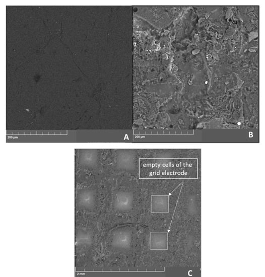 All electrochemical measurements were conducted on a portable PalmSens 4 Potentiostat analyzer (Palm Instruments BV, Houten, The Netherlands) in a three-electrode arrangement with a LRGO electrode prepared as described above as a working electrode, Ag/AgCl (1 mol/L KCl) as a reference electrode, and a platinum wire as a counter electrode. The structure and morphology of the LRGO electrodes (planar or grid) were investigated by high-resolution scanning electron microscopy (SEM) (Vega 3H, Tescan, Brno, Czech Republic) at Tomsk State University (Tomsk, Russia).