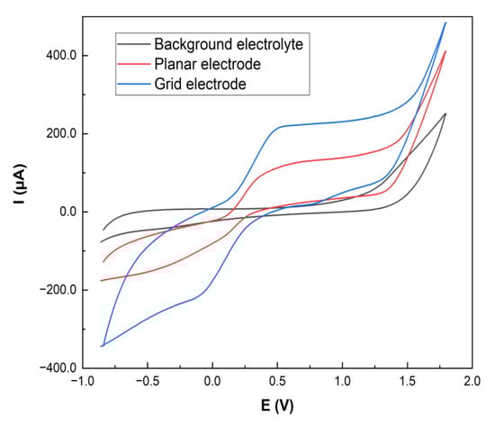 The electrochemical behavior of the LRGO planar and grid electrodes was investigated by CV using 0.01 mol/L [Fe(CN)6]3−/4− in 0.1 M KCl as a probe at 100 mV/s (Figure 3).