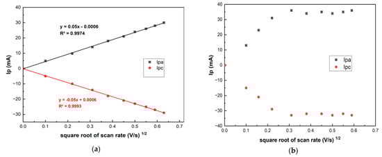 The dependences of the CV redox peak currents of 0.01 mol/L [Fe(CN)6]3−/4− in 0.1 mol/L KCI on the square root of scan rate on LRGO planar (a) and LRGO grid (b) electrodes.