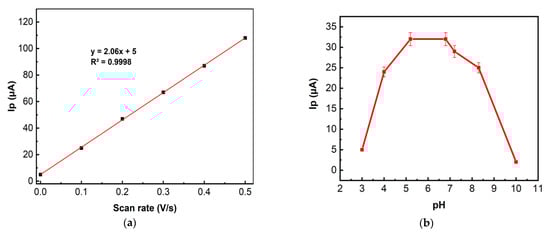 (a) The dependence of the carbaryl (15 mg/L in 96% ethanol and deionized water (1:1)) CV anodic peak currents in BR buffer solution (7.00 pH) on the scan rate (0.1 V/s to 0.5 V/s); (b) Influence of pH on the LSV anodic peak current of carbaryl (15 mg/L in 96% ethanol and deionized water (1:1)) on the LRGO grid electrode in BR buffers of different pH values; scan rate of 300 mV/s. n = 3