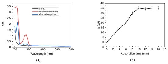 To prove that the LRGO grid electrode can be used for the adsorptive accumulation of carbaryl, UV–vis spectra of the carbaryl solution before and after adsorption are shown in Figure 7a. The freshly prepared carbaryl (15 mg/L) showed a maximum absorbance at 275 nm, which is the characteristic absorbance peak of carbaryl [32]. After the LRGO grid electrode was immersed into the carbaryl solution for 10 min (maximum adsorption time), the absorbance decreased, indicating the decreased amount of carbaryl in the solution due to adsorption of some carbaryl onto the LRGO grid electrode surface. The measurement of the absorbance of the carbaryl solution before and after adsorptive accumulation on the LRGO grid electrode was carried out by transferring a drop of the solution from the electrode surface to the micro cuvettes (volume of 4 μL) of the spectrophotometer. It should be noted that rGO particles are firmly bounded on LRGO grid electrode and thus do not diffuse into carbaryl solution and do not interfere with carbaryl spectrophotometric monitoring as confirmed by control experiments.