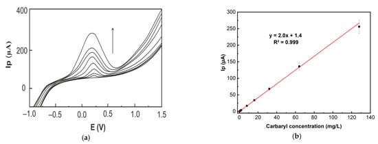 (a) Anodic LSVs of carbaryl (increasing concentration 0; 0.25; 1.0; 2.0; 8.0; 16.0; 32.0; 64.0; 128.0 mg/L in 96% ethanol and deionized water (1:1)) at LRGO grid electrode in PBS (pH 6.86) at 300 mV/s. The adsorptive accumulation time of carbaryl from the solution was 10 min. (b) Calibration dependence of the LSV anodic peak height on carbaryl concentration.