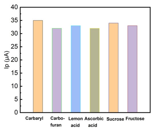 LSV anodic peak height of carbaryl (16 mg/L in 96% ethanol and deionized water (1:1)) at LRGO grid electrode. Adsorptive accumulation for 10 min in PBS (pH 6.86) containing carbaryl in the absence and presence of 10-fold concentration of carbofuran, citric and ascorbic acids, sucrose and fructose, respectively. The scan rate 300 mV/s.