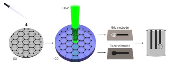 A polyethylene terephthalate (PET) sheet 5 × 25 mm2 in size was used as a substrate for graphene oxide (GO) film deposition by the drop-casting method without further treatment to obtain a homogeneous electrode surface (see Figure 10). The drop casting dispersion volume, concentration and solvent were optimized to obtain the most effective electrodes in terms of sensitivity and reproducibility. Briefly, 100 µL of GO (2 mg/mL) was deposited by drop-casting on the PET surface and dried carefully for 2 h at laboratory temperature (22 ± 2 °C). GO to rGO conversion was performed using a laser engraver with an optimal power (600 mW) at wavelength of 405 nm. There are two types of engraved electrodes: either with planar or with grid geometry. The second one enhances the surface section’s sensitivity to the pesticide, and thus it was used in this paper. The size of the working grid was 12.57 mm2. The distance between the electrode and the laser head was 5 mm to prevent burning during the reduction.
