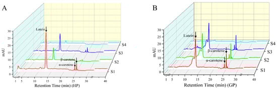 HPLC profiles of carotenoid compositions in young pomelo fruits. (A) Honey pomelo; (B) Golden pomelo. S1~S4 indicate different developmental stages.