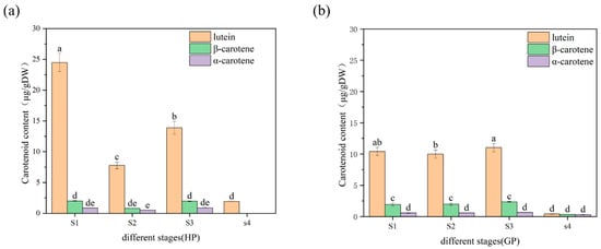 Changes in carotenoids content and compositions in pomelo young fruit. (a) Changes in carotenoids content and composition of honey pomelo during four developmental stages; (b) Changes in carotenoids content and composition of golden pomelo during four developmental stages. Different letters indicate significant differences between values (p < 0.05).