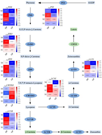 2.2. Differential Genes Expression in Carotenoid Biosynthesis Pathway