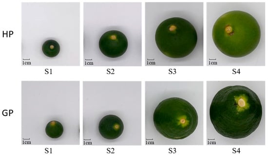 Pomelo fruit development stages. S1–S4 four sampled stages during fruit development. The upper fruits are “Golden pomelo” (GP) and the down fruits are “Honey pomelo” (HP).