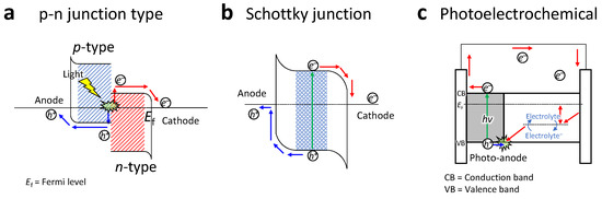 Figure 1 exhibits several working mechanisms for the generation of photocurrent in photodetectors: the p-n junction type, the Schottky junction type, and the photoelectrochemical (PEC) type. The p-n junction and Schottky junction have similar mechanisms in which electron–hole pairs (e.g., excitons) are generated at the interface of the p-n type semiconductor for the p-n junction type (Figure 1a), or at the interface of a metal semiconductor for a Schottky junction, are separated by an applied electrical field (Figure 1b). However, in self-powered mode, spontaneously built-in electrical potential encourages separation of the excitons and drives them to the desired electrodes. On the other hand, the PEC type of mechanism encourages the excitons to separate toward anodes and cathodes via the energy barrier between the electrode and the electrolyte (as shown in Figure 1c). By using the PEC type structure, complete electron-circuit through the oxidation and reduction process in the electrolyte can be implemented in the self-powered PEC photodetector without consuming energy. Figure 1a shows an energy diagram where a space charge layer is formed due to the carrier concentration gradient at the junction when a p-type semiconductor and an n-type semiconductor are “junctioned” together and illuminated from the outside. An internal local electric field is formed in the p-n junction region, and when the light illuminates this part, the photogenerated electrons and holes move via the local electric field of the junction to generate a photocurrent [59,60].