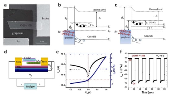 Jin et al. reported the fabrication of self-powered high-performance photodetectors using CdSe nanobelt (NB)/graphene, as shown in Figure 2a [61]. Graphene and Au are utilized as heterogeneous metal electrodes in the photodetector system to form a Schottky junction with CdSe NB. The difference in work function between CdSe (4.2 eV) and graphene (4.6 eV) will result in spontaneous built-in electrical potential. Energy band diagrams in a short circuit and with an external resistor are depicted in Figure 2b,c, respectively. When photon energy greater than the band gap energy of CdSe NBs is irradiated, the excited holes and electrons are separated by the built-in field and move to graphene and CdSe NB sides, respectively. The high photoresponsivity (10.2 AW−1) and gain (28) of the self-powered CdSe NB/graphene photodetector were obtained. The vertical junction of different 2D nanomaterials creates an unprecedented different charge transport behavior.