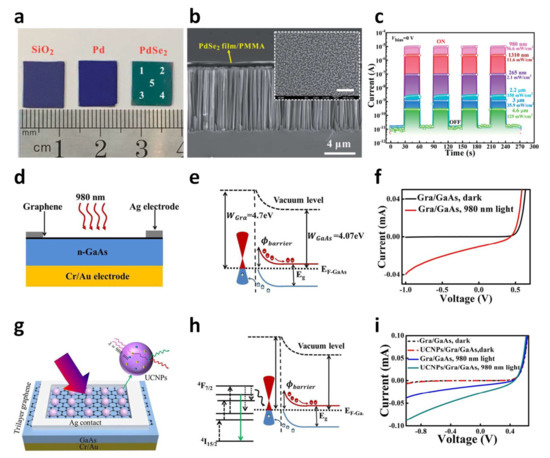(a) Photographs of the SiO2/Si substrate, a Pd film, and a PdSe2 film formed on the SiO2/Si substrate. (b) Cross-sectional SEM image of a PdSe2 heterostructure vertically stacked on SiNWA. The inset shows a top view image of the heterogeneous structure. (c) Time vs. photocurrent plot of PdSe2/SiNWA heterostructure devices under illumination at different wavelengths (from 980 nm to 4.6 μm) at Vbias = 0 V. Reproduced with permission from [63]. Copyright 2020, Royal Society of Chemistry. (d) A cross-section view of a graphene/GaAs photodetector. (e) Electronic band alignment of the graphene/GaAs heterojunction. (f) I-V behavior of the graphene/GaAs photodetector in the dark (black) and under illumination from a 980 nm laser (red). (g) Top view of a graphene/GaAs photodetector coated with UCNPs. (h) Electronic band diagram of the UCNP/graphene/GaAs structure. (i) I-V behavior of graphene/GaAs or UCNP/graphene/GaAs photodetectors in the dark and under illumination from a 980 nm laser. The light illumination power is 55 mW. Reproduced with permission from [64]. Copyright 2018, Royal Society of Chemistry.