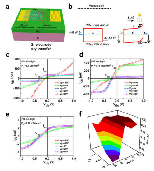 Zhou et al. reported an asymmetrical metal–semiconductor–metal (MSM) photodetector by using graphene and Au as the electrode contacting the WSe2 flake. The graphene and WSe2 were vertically stacked in part to form the van der Waals contact via the dry-transfer method [65]. Figure 4a is an illustration of a graphene-WSe2-Au photodetector on a SiO2/Si wafer substrate. As shown in the illustration, graphene and WSe2 are superimposed on each other in the middle. Figure 4b shows an energy band diagram of the photodetector with a graphene-WSe2-Au metal–semiconductor–metal (MSM) structure in the presence of light. It shows a large Schottky barrier difference between graphene and Au. In particular, in order to avoid surface material defects that can be induced through the process, and unavoidable doping and Fermi level pinning at the interface, a PDMS-assisted dry transfer method was utilized without the use of a metal deposition system. The WSe2 flake was at first transferred onto the pre-patterned Au electrodes, and the multilayer graphene flake was sequentially transferred onto the WSe2 flake. The fabricated asymmetric photodetector composed of graphene–WSe2–Au has self-powered characteristics, as evidenced by the Isc − Voc curve under light illumination, at a variety of wavelength ranges (405, 532, 780 nm) as shown in Figure 4c–e. Figure 4f summarizes the dependence of Voc and the corresponding light power density on the gate voltage bias under a 780 nm wavelength. In conclusion, the graphene–WSe2–Au photodetector demonstrated similar gate-tunability through the change of light power intensity.