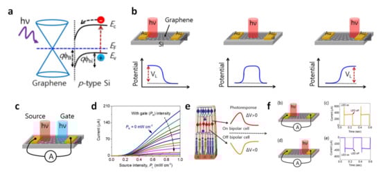 Kumar et al. demonstrated a graphene/p-type Si-based electronic circuit modulated by a light illumination logic gate [66]. The graphene/p-type Si-based electronic circuit operates over a broad spectral range from ultraviolet to a near-infrared range under a zero bias. Figure 5a shows an electronic energy band diagram of the graphene/p-type Si-based electronic circuit. Due to the Fermi level pinning of graphene and p-type Si, and the formation of a Schottky barrier, energy band bending occurs at the interface between them, which might force the separation of excitons. According to the principle, a photon-induced electro-gating effect on the graphene/p-type Si can be observed on a selective area with a small spot size laser source, as shown in Figure 5b. Photon-induced potential can break the symmetry between the metal electrodes. Figure 5c is a schematic of a photon-triggered transistor (PTT). By modifying the appropriate driving source (light intensity, PL) and optoelectronic gate (PR) optical inputs, the PTT offers a way to inject the photogenerated carriers locally. Figure 5d shows the current–illuminance intensity (I-PL) curve as a function of light intensity from 0 to 1 mW cm−2. The device exhibits a current of up to 190 μA when powered only with light, and with no voltage applied. In particular, to mimic the human retina, we made an electronic device that mimics cells based on the voltage difference, as shown in Figure 5e, and that determines the polarity of the current according to the local location of the light. Thus, incident light near the left junction (PL > 0 and PR = 0) generates a current in both directions, as shown in Figure 5f. Conversely, when PL = 0 and PR > 0, the current changes in the negative direction.