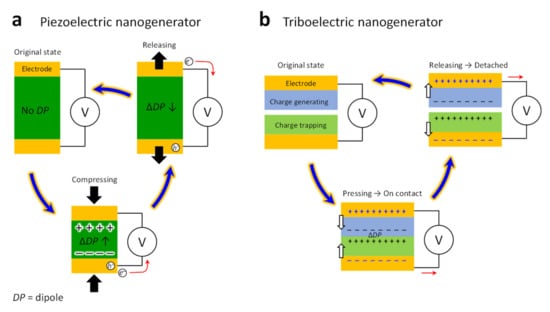The mechanism underlying PENG operations is the direct piezoelectric effect. The piezoelectric effect is the electrical polarization of dielectric materials. In a direct piezoelectric mechanism, a force is applied along the asymmetric direction of the dielectric material, and a charge is generated on the opposite surface. When the applied force is removed, the dielectric material returns to its original state (Figure 6a) [68]. On the other hand, the fundamental operation of a TENG is a sequential state between contact and separation to realize the constant transfer of a charge, as shown in Figure 6b [67]. The charge-generating and -trapping materials make contact with each other, and dipoles are generated. Then, when the deformation is released and the materials detach, the opposite charges of the two surfaces will separate, so that these opposite triboelectric charges will generate an electric field between them, and thus, a difference of potential is induced between the top and bottom electrodes. Finally, the electrons will be driven to flow from one electrode to the other through the external load.