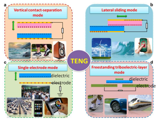 Four basic modes of operation in triboelectric nanogenerators: (a) vertical contact separation mode, (b) side-sliding mode, (c) single-electrode mode, and (d) standalone mode. Reproduced with permission from [73], Copyright 2015, Royal Society of Chemistry.