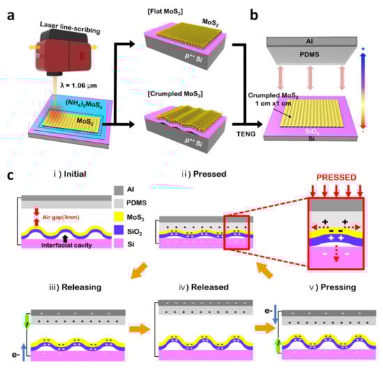 Park et al. characterized TENG devices consisting of either flat or crumpled MoS2 layers. The crumpled MoS2 was synthesized by laser-directed thermolysis [74]. Figure 10a is a schematic for fabrication of the flat and crumpled MoS2 using a laser line-scribing machine on an (NH4)2MoS4–coated Si wafer substrate. The photothermal interaction induced by the laser creates sufficient heating of the (NH4)2MoS4 film, which forms a 2D MoS2 layer. Interestingly, if the irradiation intensity of the laser is stronger than 2.62 Jcm−2, the crumpled structure of the MoS2 layer is formed. As illustrated in Figure 10b, either the flat structure or the crumpled structure of the 2D MoS2 is utilized to fabricate a contact-separation type TENG to figure out the nanostructure effect of 2D MoS2 layers. PDMS, which is a commercial silicone elastomer, is used as a counterpart triboelectric material. As shown in Figure 10c, in crumpled MoS2, two operating principles are involved: contact charging and electrostatic induction. In the initial state (i), there is an air gap between the MoS2 and the Al/PDMS composite electrode, so that no electron flow occurs, and in (ii), when contact between the two layers occurs, a triboelectric charge is formed on the surface due to electron transfer from PDMS to the MoS2. Compared to the less crumpled and most crumpled MoS2, the most crumpled MoS2 results in a greater shear friction effect on the device. On the other hand, a flat MoS2 produces almost no shear friction. When a negative triboelectric charge is generated on the most crumpled MoS2 surface, the PDMS surface is converted to a positively charged state. Thereafter, as we separate the Al/PDMS electrode from MoS2, in (iii), the potential within the separation generates a current from the MoS2 side to the Al/PDMS electrode side throughout the external circuit to compensate for the friction charge generated by electrostatic induction. When fully released and returned to the original state, in (iv), the balanced charge does not generate any current. When a mechanical force is again applied to the device, as seen in (v), a friction charge is again formed on the surface and the principle seen in step (ii) is repeated.