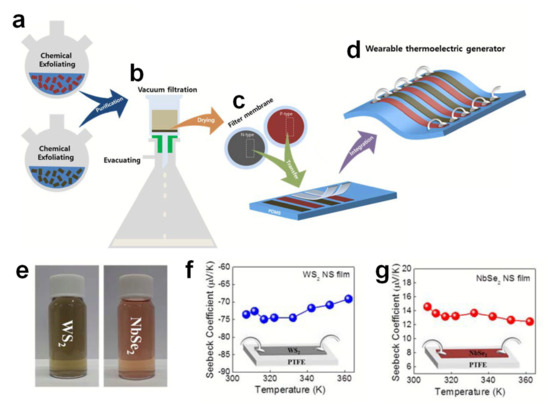 Chemically exfoliating TMD nanosheets and manufacturing a wearable thermoelectric generator using TMD nanosheets: (a) preparation of chemically exfoliated TMD, (b) vacuum filtration of TMD nanosheets using a membrane filter, (c) transfer of a vacuum-filtered TMD nanosheet film to a PDMS substrate using a contact printing method, and (d) the connection between Ag wire and thermoelectric film using Ag paste. (e) WS2 and NbSe2 dispersed in aqueous solution, With graphical representations of thermoelectric properties from 300 K to 360 K for chemically exfoliated (f) WS2 and (g) NbSe2. Reproduced with permission from [76], Copyright 2016, Royal Society of Chemistry.