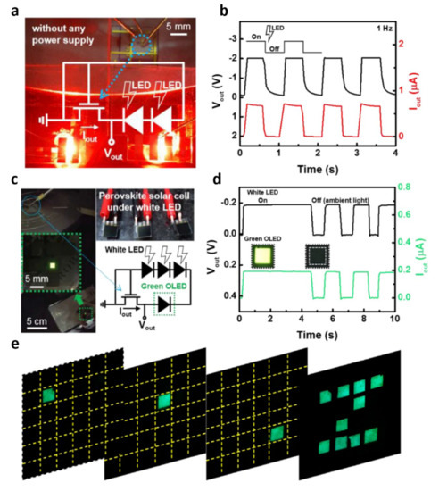 The aforementioned 2D material–based self-powered sensors offer extremely low power consumption, and integrated applications have been developed. A self-powered circuit integration of perovskite cells and 2D MoTe2 transistors was successfully demonstrated by Im et al. in 2019 [77]. Methylammonium lead iodide perovskite photovoltaic cells connected with MoTe2 transistors provided a dynamic response under a red light pulse at 1 Hz (Figure 14a,b). Furthermore, they implemented photovoltaic-powered green organic light-emitting diodes (OLEDs), presenting pulsed green light illumination according to white light–source switching behaviors (Figure 14c,d). From remarkable progress in 2D materials–based self-powered sensor integration, a TENG integrated array using MXene was demonstrated by Shan et al. in 2021 [78]. An alternating current electroluminescence (ACEL) array connecting TENG device integrations led to a self-powered pattern display. The flexible and transparent 4 mm2 ACEL display arrays successfully exhibited pattern Z (Figure 14e).