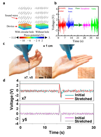 Self-powered sensor integrations: (a) a piezo-potential distribution analysis of acoustoelectric conversion and (b) output voltage characteristics conducted with different musical instruments under that sound pressure level. Reproduced with permission from [79], Copyright 2021, American Chemical Society. (c) TENG touch sensor integration on the palm of the hand, and (d) output voltage measurement before and after stretching. Reproduced with permission from [80], Copyright 2019, Elsevier.