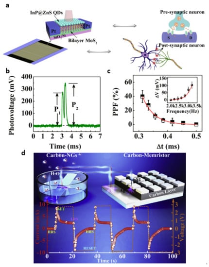 Self-powered neuromorphic systems: (a) the InP@ZnS-MoS2 hybrid phototransistor and a neural network with a multiple series−parallel synapses schematic, (b) paired-pulse facilitation (PPF) induced by two laser pulses under a 532 nm laser at 170 mW·cm−2, and (c) dependence of the PPF on the interval between paired pulses (Δt) from a 532 nm laser at 170 mW·cm−2; the inset shows the variance of the photovoltage as a function of pulse frequency from 2000 to 3200 Hz. Reproduced with permission from [81], Copyright 2020, American Chemical Society. (d) A self-powered system using carbon-NGs cells connected in series with a memristor. The air velocity is controlled at ~1.0 ms−1. The output current versus the time for the carbon memristor after integrating it with three carbon-NGs cells shows the expected voltage output. Reproduced with permission from [82]. Copyright 2019, Elsevier.