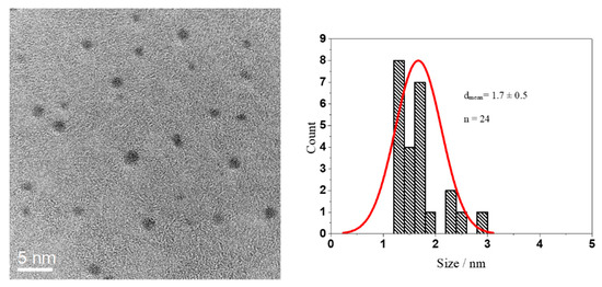 HRTEM image of Au-GSH nanoparticles (left) and particle size distribution (right).