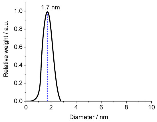 Glutathione-coated gold nanoparticles (Au-GSH) and BSA-functionalized gold nanoclusters (Au-BSA) were used as model compounds for the delivery of theranostic nanoparticles into the colon. Glutathione (GSH) is a tripeptide consisting of the three amino acids, glutamic acid, cysteine, and glycine. It can bind to gold via the thiol group of the central cysteine after reduction with the strong reducing agent NaBH4, which leads to ultrasmall gold nanoparticles [67,68,69,70,71,72]. The Au-GSH nanoparticles were characterized with respect to size and composition. High-resolution transmission electron microscopy (HRTEM) provided information about the size and morphology of the nanoparticles (Figure 1). Au-GSH particles are shown in the HRTEM image with an average core diameter of 1.7 ± 0.5 nm. This was in good agreement with the results from disc centrifugal sedimentation (DCS) that gave the hydrodynamic diameter of water-dispersed nanoparticles (Figure 2). This confirms well-dispersed nanoparticle without significant agglomeration.