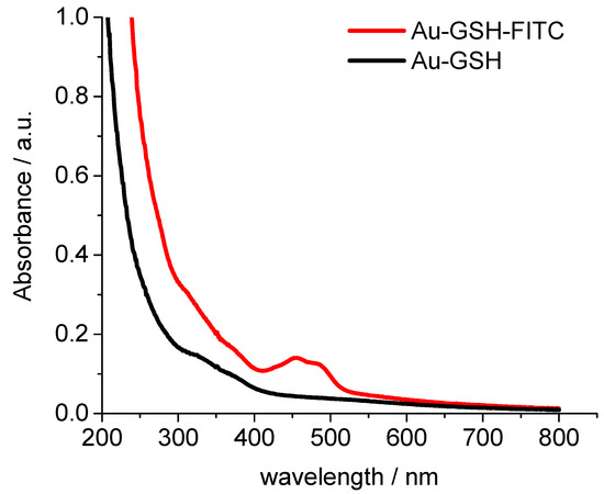 UV-Vis spectra of glutathione-functionalized ultrasmall gold nanoparticles before (black) and after labelling with NHS fluorescein (FITC) (red).