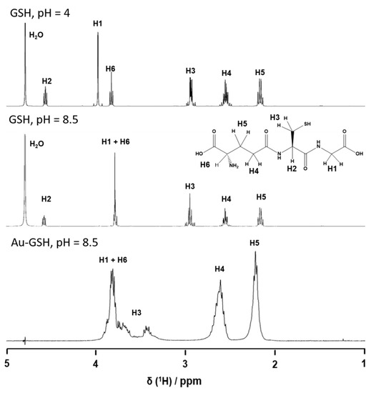 The ligand structure is accessible by NMR spectroscopy, as the nanoparticles are ultrasmall. The 1H-NMR spectra of pure GSH in D2O at pH 4 and 8.5 showed all expected peaks and a notable pH-dependence of the chemical shifts. Figure 4 gives all relevant protons and their assignments in the spectra (see [73] for extensive NMR studies in ultrasmall Ag-GSH nanoparticles). The spectrum of Au-GSH nanoparticles shows broadened, downfield-shifted signals. This NMR peak broadening is a well-known phenomenon that is caused by the presence of a metallic nanoparticle core [73,74,75,76,77]. It depends on the distance between magnetic nucleus and the metal particle. Therefore, the signal of the (alpha) protons of the cysteine was most shifted and decreased in intensity. The NMR spectrum of the particles was measured with water suppression, which also suppressed the signal of the H2 proton due to its close proximity to the water signal. The absence of sharp NMR signals in the spectrum of the Au-GSH nanoparticles confirmed that there were no residual or detached ligands in the dispersion (Figure 4).