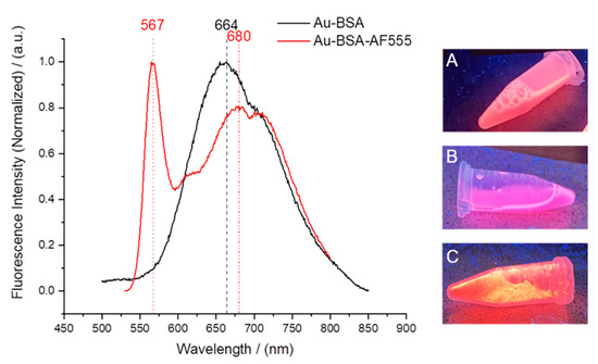 (Left): Fluorescence spectra of Au-BSA and Au-BSA-AF555 nanoclusters. (Right) Images of fluorescing nanoclusters under UV irradiation: Au-BSA dispersion (A), Au-BSA-AF555 dispersion (B), and solid Au-BSA-AF555 freeze-dried with trehalose (C).