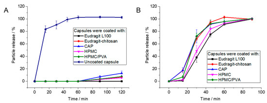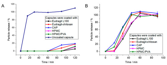 For uncoated gelatin capsules, rapid particle release was observed at pH 1 as the capsules were easily dissolved. The enteric-coated capsules released 12% at most after 2 h, depending on the enteric coating polymer. In contrast, the coated capsules showed rapid release of particles within 90 min at pH 7.1, i.e., under the neutral conditions in the colon (Figure 6 and Figure 7). As passage from the stomach to the colon takes hours [7,82,83,84,85], this release rate is well suited to transporting particles to the colon.