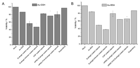 Viability of HeLa cells in the MTT assay in the presence of the components of dissolved enteric-coated capsules and suppositories, previously loaded with Au-GSH nanoparticles (A) and Au-BSA nanoclusters (B) (mean ± standard deviation; n = 3).