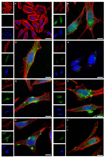 Confocal laser scanning microscopy images of HeLa cells after 24 h cultivation (control; (A)), and after incubation for 24 h with dispersed Au-GSH-FITC nanoparticles (70 µg mL−1) (B). The uptake of Au-GSH-FITC nanoparticles from coated gelatin capsules after dissolution is shown in (C) for Eudragit (88 µg mL−1), (D) for Eudragit-chitosan (65 µg mL−1), (E) for cellulose acetate phthalate (CAP; 60 µg mL−1), (F) for hydroxypropylmethylcellulose-Eudragit (HPMC-Eudragit; 60 µg mL−1), and (G) for hydroxypropylmethylcellulose-polyvinylalcohol-Eudragit (HPMC-PVA-Eudragit; 72 µg mL−1). (H) The uptake of Au-GSH-FITC nanoparticles after release from a hard-fat suppository (62 µg mL−1). Red: actin (cytoskeleton); blue: cell nucleus; green: Au-GSH-FITC nanoparticles. Scale bar 10 µm. All given concentrations refer to gold in the cell culture well.