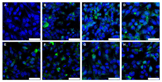 Confocal laser scanning microscopy images of HeLa cells after 24 h cultivation (control; (A)) and after 24 h incubation with Au-BSA nanoclusters (43 µg mL−1 Au) (B). The uptake of Au-BSA nanoclusters from dissolved capsules is shown in (C) for Eudragit (42 µg mL−1 Au), (D) for Eudragit-chitosan (42 µg mL−1 Au), (E) for CAP (45 µg mL−1 Au), (F) for HPMC-Eudragit (50 µg mL−1 Au), and (G) for HPMC-PVA-Eudragit (47 µg mL−1 Au). (H) The uptake of Au-BSA nanoclusters after release from a suppository (52 µg mL−1 Au). Blue: nucleus; green: Au-BSA nanocluster autofluorescence. Scale bar 50 µm. All given concentrations refer to gold in the cell culture well.