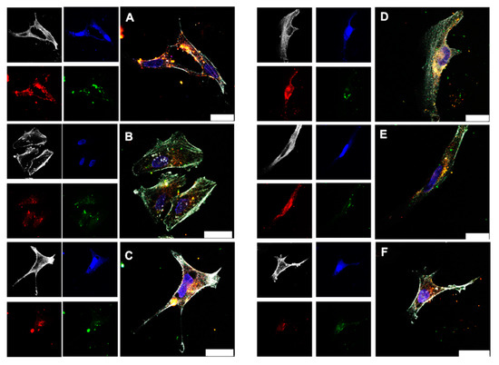Confocal laser scanning microscopy images of HeLa cells incubated for 24 h with dispersed Au-BSA-AF555 nanoclusters (13.3 µg mL−1 Au) (A). The uptake of Au-BSA-AF555 nanoclusters from dissolved capsules is shown in (B) for Eudragit (14.5 µg mL−1 Au), in (C) for CAP (15.4 µg mL−1 Au), in (D) for HPMC-Eudragit (17.0 µg mL−1 Au), and in (E) for HPMC-PVA-Eudragit (16.5 µg mL−1 Au). (F) The uptake of Au-BSA-AF555 nanoclusters after release from a suppository (22 µg mL−1 Au). Grey: actin; blue: nucleus; green: Au-BSA autofluorescence; red: Au-BSA-AF555 fluorescence from AF555. Scale bar 25 µm.