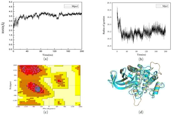 (a): Root mean square deviation (RMSD) values of 6H3K protein in apo protein; (b): The radius of gyration of 6H3K protein in apo protein. (c): Ramachandran diagram of Mps1 protein structure after optimization. (d): Comparison of conformational overlap between the original 6H3K protein (wheat) and the 200 ns protein (blue).