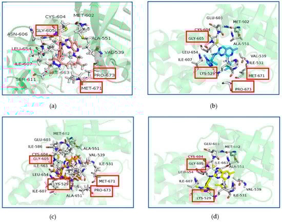 In the case of hydrophobic effect, we used ExPASy Server [25], and the common hydrophobic effect of this small molecule compound has been studied in the clinical 1 inhibitor BOS172722. The results are shown in Figure 8 and positive value represents hydrophobicity (higher values mean stronger hydrophobicity). We found that there was a total of ten residues that formed strong hydrophobic interaction with the inhibitor and seven of them were key residues. They were Ile531, Val539, Cys604, Gly605, Leu654, Ile663, Pro673, and all located in the ATP binding pocket. This was consistent with the results obtained by molecular docking and dynamics simulations.