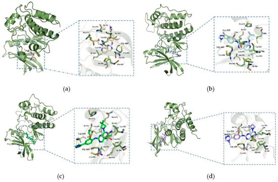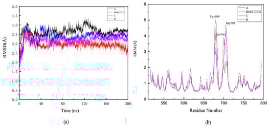 The RMSF was an analysis method that can measure the fluctuation of each amino acid residue in the dynamic state of a protein during an MD simulation. A higher RMSF value indicates a residue has low stability; conversely, a lower RMSF value indicated that a residue has high stability. In order to evaluate the influence of different small molecule inhibitors on the fluctuation of each amino acid residue in the protein during the MD simulations, we calculated the RMSF values of each amino acid residue in the four systems. The results were shown in Figure 5b. The RMSF profiles of each residue in the four systems showed similar patterns, all of which were consistent with that of the apo protein. We also found that three residues, namely Lys680, Ser700, and Gly705, which were far away from the binding site, exhibited relatively high RMSF values, probably because these residues were located in the loop region of the kinase, which has greater structural flexibility. We also found that Pro673 had a higher RMSF value in compound D than in compounds A, BOS172722, and C.