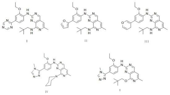 Based on the above results, we found that the pyrido [3,4-d] pyrimidine skeleton has a close hydrophobic interaction with the hinge region of Mps1, so we used this skeleton as the core structure. Because BOS172722 can form stable hydrogen with Lys529 bond and had stable hydrophobic interactions with key hydrophobic pockets. Considering these, the core fragment of BOS172722 was chosen to act as the starting structure for new inhibitor design. According to the LUDI-guided identification of interactions fragments, five new compounds were obtained and structures were shown in Figure 9. We used density functional theory B3LYP/6-G in Gaussian09 software to optimize the molecular geometry of five small molecules. We used Autodock for docking, it can be noticed that the binding energy of I, IV, and V has higher values than that of II, III.