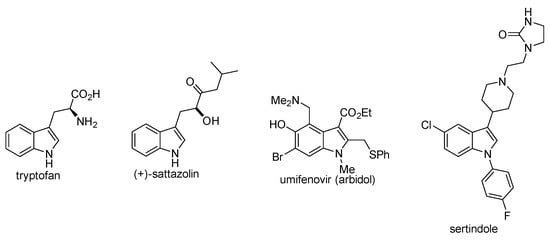 Heterocyclic compounds are cyclic compounds that each contain either a heteroatom or a number of heteroatoms. Among the most important groups of heterocyclic compounds are the aromatic heterocyclic compounds. Well-known examples of such compounds include pyridine, pyrrole, thiophene, and furan. Indoles occupy a unique position within the field of heterocyclic compounds. An indole is a condensed compound that is composed of a benzene and pyrrole core. The importance of indoles and their derivatives is illustrated by the examples shown in Figure 1. Tryptophan is an aromatic essential amino acid, and sattazolin [1] and umifenovir [2] are indole derivatives with antiviral effects. N-arylated indoles also belong to the group of important indole derivatives. An example of such a compound is sertindole, which is used as an antipsychotic drug [3]. Due to the significant biological activity of the indole derivatives, much attention has been paid to the modification of the indole unit [4,5,6,7,8].