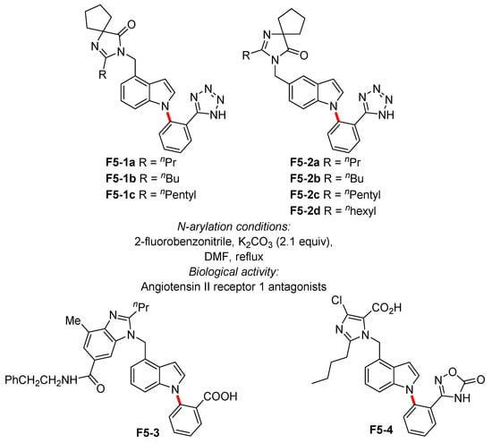 - Zhu, W.; Bao, X.; Ren, H.; Da, Y.; Wu, D.; Li, F.; Yan, Y.; Wang, L.; Chen, Z. N-Phenyl Indole Derivatives as AT1 Antagonists with Anti-Hypertension Activities: Design, Synthesis and Biological Evaluation. Eur. J. Med. Chem. 2016, 115, 161–178. [Google Scholar] [CrossRef]