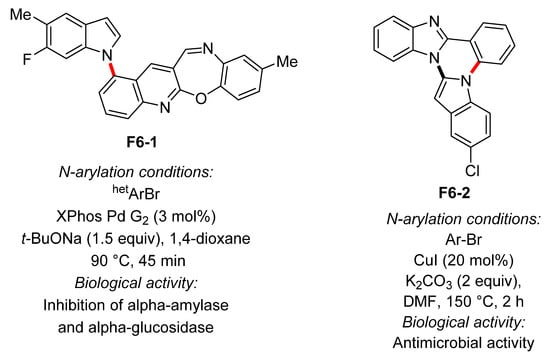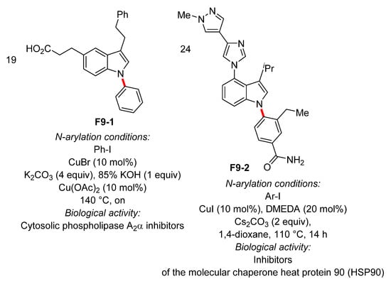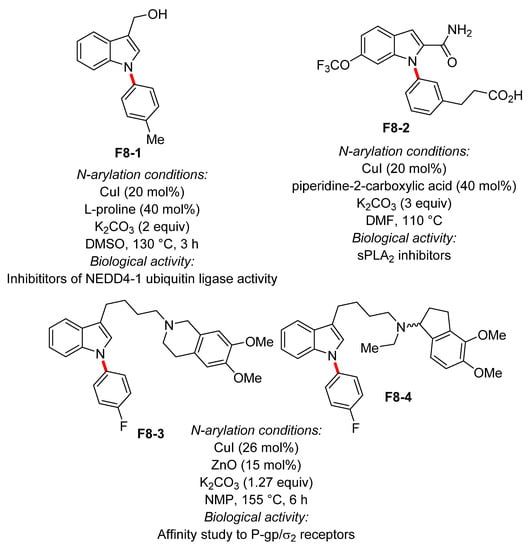 Other examples of Buchwald–Hartwig indole N-arylation include the use of the ligands F4-1 [81], F4-2 [82], and tBuXphos (F4-3) [83] (Figure 4). In addition, the palladium-catalyzed amination of triflates [84,85]; cross-coupling reactions of silylated indoles with aryl halides [86,87]; and reactions that are catalyzed by Pd/ZnO nanoparticles [88], palladium immobilized on graphene [89], or silica-starch substrates [90] were used to prepare N-arylindoles. However, these procedures have mainly been developed for the N-arylation of amines, whereas the N-arylation of indoles was given for only a limited number of indole derivatives.