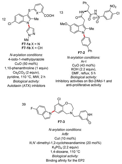 Recently, the use of NiO nanoparticles for the N-arylation of indoles by means of the reaction of boronic acids with indoles in the presence of NiO nanoparticles as a catalyst has been reported [58]. Pure NiO nanoparticles were prepared using the quercetin-mediated (F2-1, Figure 2) hydrothermal method.