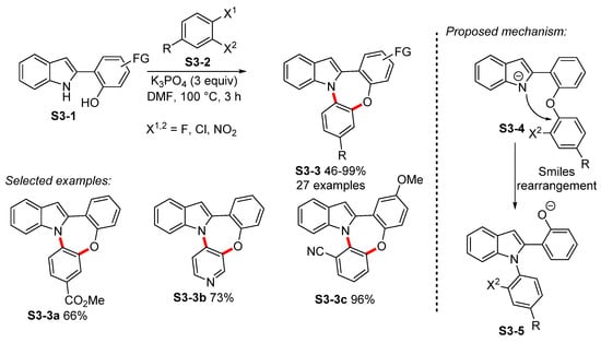 The second and seemingly most frequently used approach is based on nucleophilic aromatic substitution. The intramolecular N-arylation of indoles S3-1 was used for the preparation of dibenzo[b,f][1,4]oxazepines S3-3 (Scheme 3) [37]. Based on the general reaction, it appears that the methodology relies on Smiles rearrangement. This assumption has been experimentally confirmed, and the proposed mechanism assumes the formation of diaryl ether S3-4, which is converted into the N-arylated indole S3-3 by means of the Smiles rearrangement. Selected examples (S3-3a–S3-3c) show that the described procedure works in relation to the preparation of pyridine derivatives of S3-3b and in the case of the regioisomer S3-3c of the starting materials S3-2.